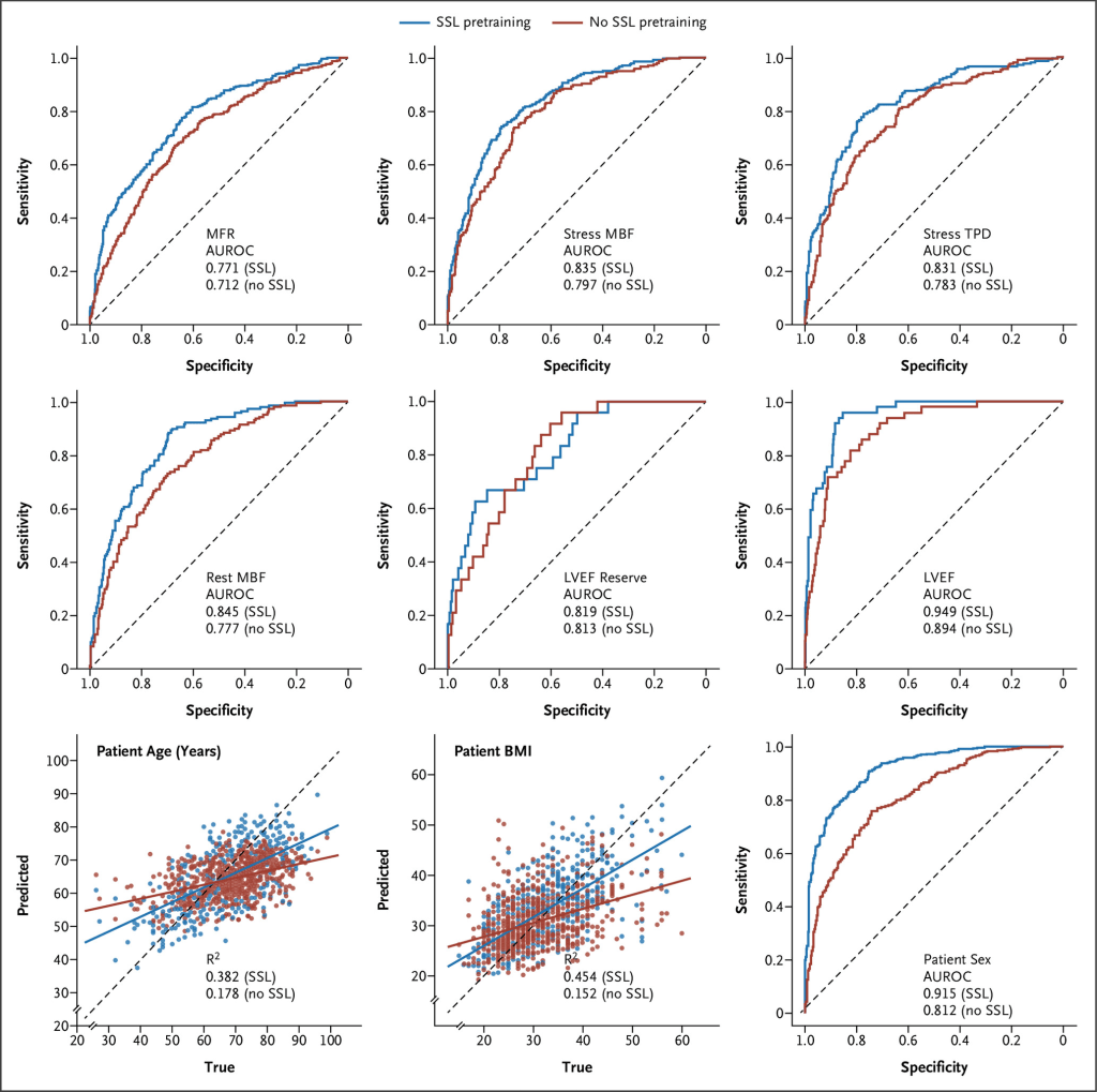 Across five independent testing cohorts, the SSL-pretrained model consistently outperformed the same architecture trained from scratch. In fact, it improved diagnostic accuracy for 11 out of 12 tasks. For example, in an external PET cohort, performance for detecting impaired MFR rose from 0.712 to 0.771 AUROC, and accuracy for identifying impaired LVEF increased from 0.894 to 0.949 with SSL pretraining.