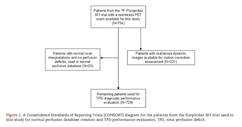 The study included patients with suspected or known coronary artery disease (CAD) who underwent rest-stress PET imaging with ¹⁸F-flurpiridaz. 4DM software was used to automatically process the images and calculate TPD.